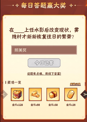 在忍者手游大全">火影忍者手游的微信公众号中每天都会有火影忍者手游相关的每日问答活动,玩家成功答对答案即可领取游戏中的道具奖励。为各位玩家带来《火影忍者手游》今日微信公众号答题分享。今天的题目会是什么样的呢?本文将和大家分享正确答案,让还不清楚的玩家也能受益。赶快来看看吧!那么2023年11月27日今天的题目会是什么样的呢?本文将和大家分享正确答案,让还不清楚的玩家也能受益。赶快来看看吧!