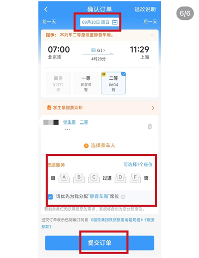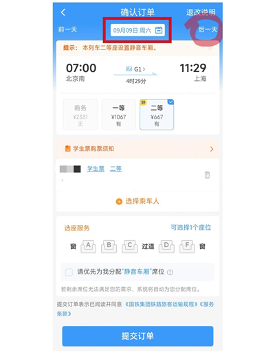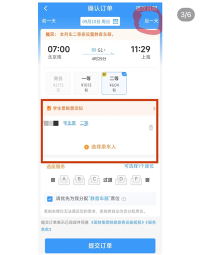 2、添加乘坐人,到预售开放时间时,点击“后一天”,直接跳转到9.11,选好座位,提交订单。