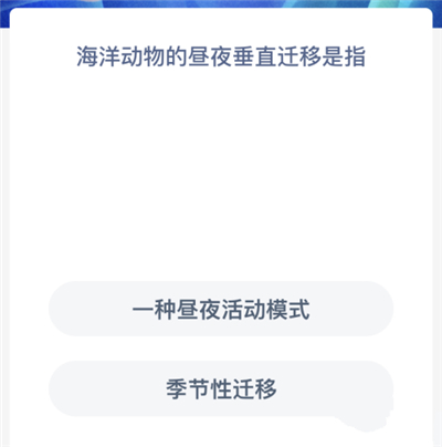 “海洋动物的昼夜垂直迁移是指?”是2023年8月3日支付宝神奇海洋科普问答题的题目,完成支付宝神奇海洋科问答后我们可以收集相关的碎片,那么支付宝问题“海洋动物的昼夜垂直迁移是指?”接下来就让我们一起来看看支付宝神奇海洋科问答答案最新内容。