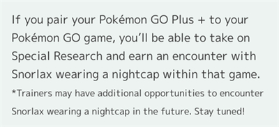 您将能够进行特殊研究,让您在将精灵宝可梦GO Plus Plus(+)与Pokemon GO配对后遇到Night Cap Snorlax。