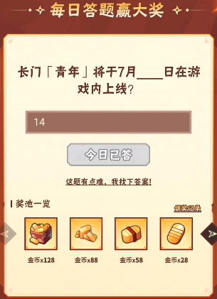 7月13日问题:长门「青年」将于7月___日在游戏内上线?