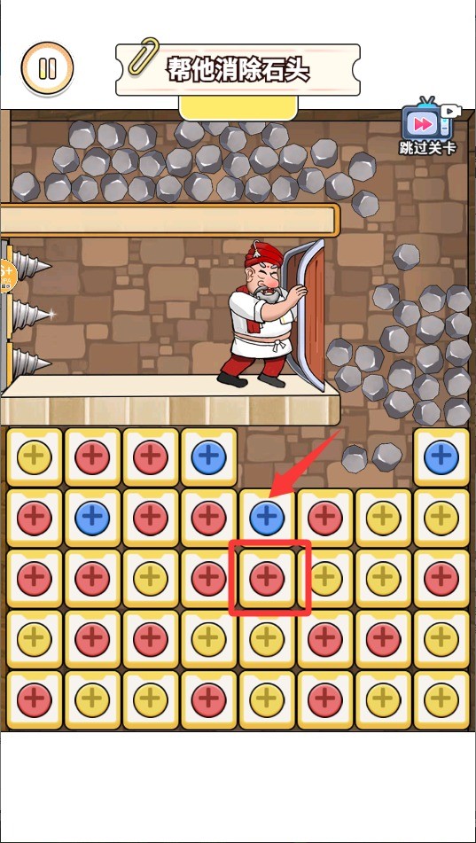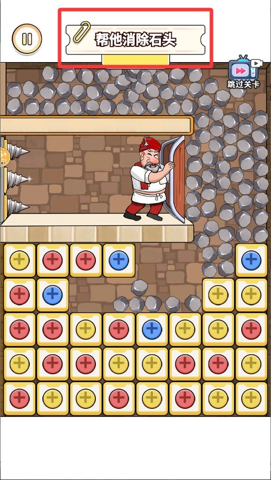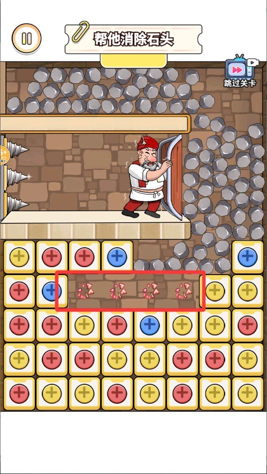 4、消除进度条累计到满格时,顶端的大型巨石会松动并坠落;合理利用巨石的滚落时机与路径,配合已清理的通道,就能为国王腾出逃生道路并顺利通关。