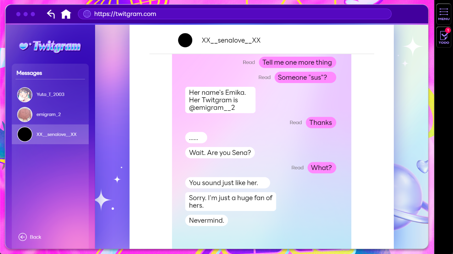你究竟是谁?达成方式:在看到她的隐藏帖子后,您与其中一位粉丝(XX__senalove__XX)交谈后立即解锁。