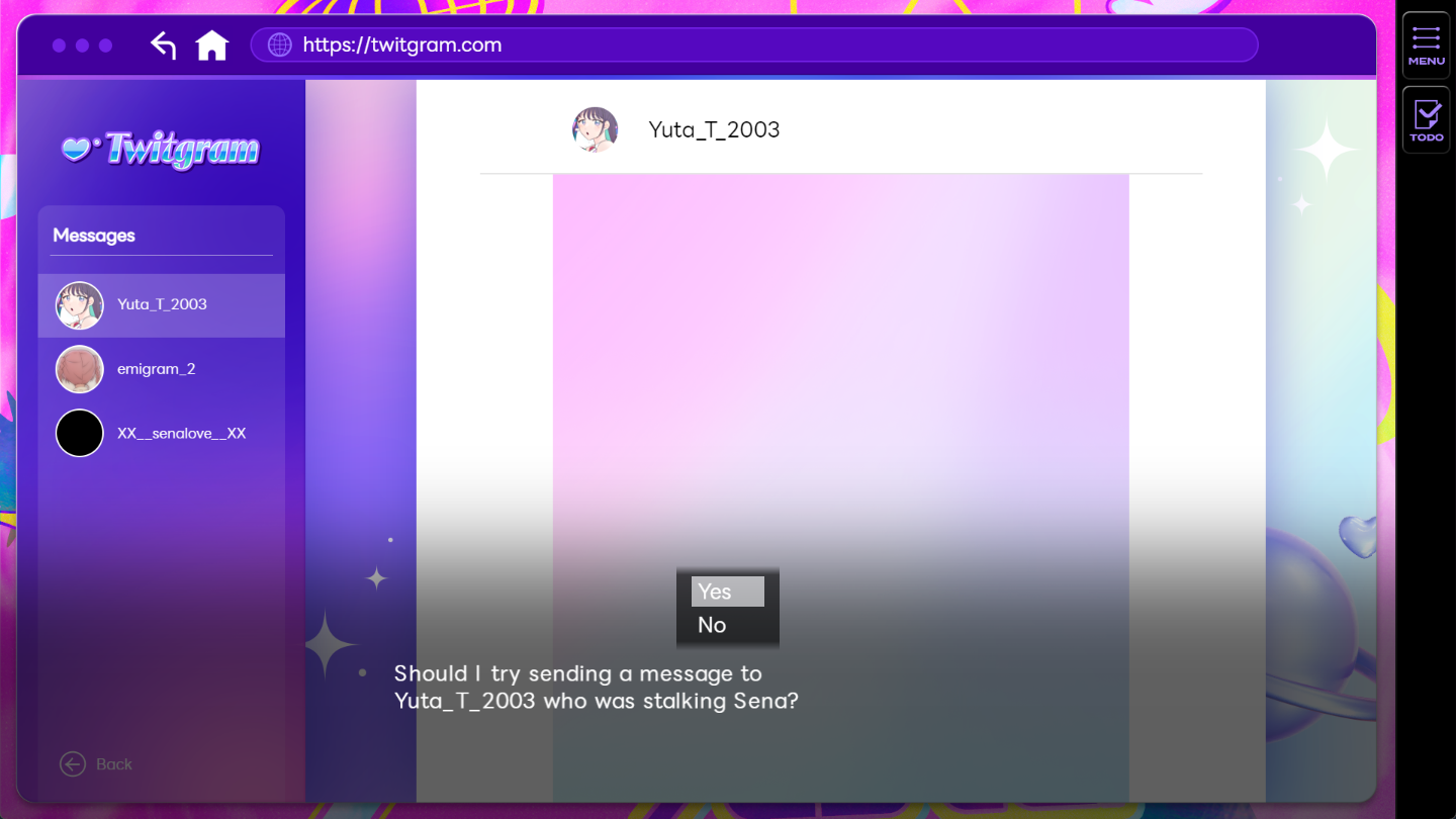 Right to Be Forgotten达成方式:在收集有关他的足够信息之前,您可以通过与跟踪者(Yuta_T_2003)对峙来获得这个结局